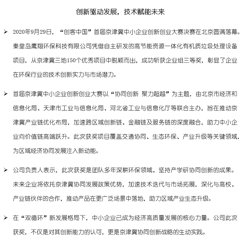 喜報!秦皇島鷹翔環(huán)??萍加邢薰緲s獲“創(chuàng)客中國”首屆京津冀中小企業(yè)創(chuàng)新創(chuàng)業(yè)大賽企業(yè)組三等獎